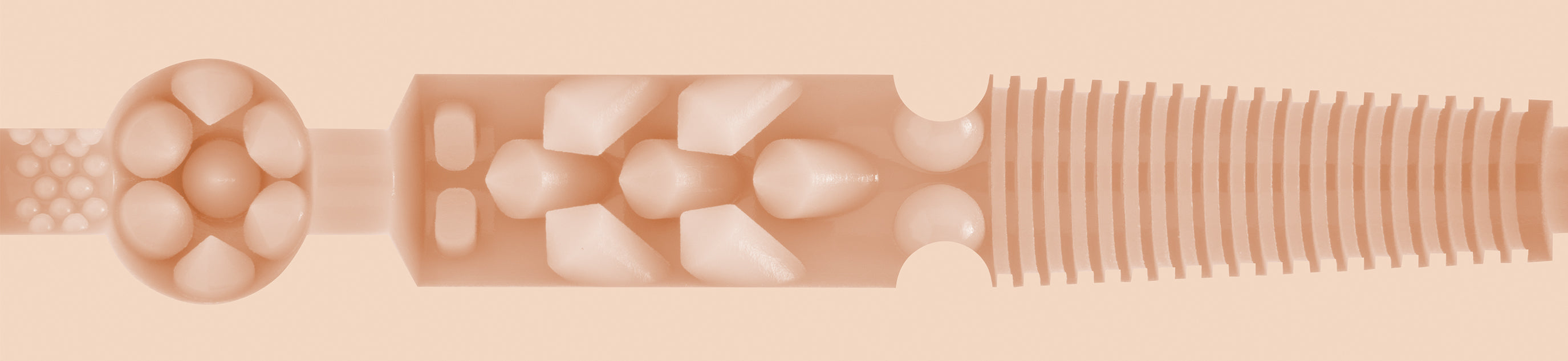 Upon entry, three small rings of bumps will grasp you tightly, followed by the ultra piercing pleasure dome that will give you 360 degrees of unmatched bliss. The next chamber starts with a small row of teeth and fangs that delightfully rub and pull at you. Finally, one row of large bumps leads into a super ribbed texture that narrows the farther you get inside.